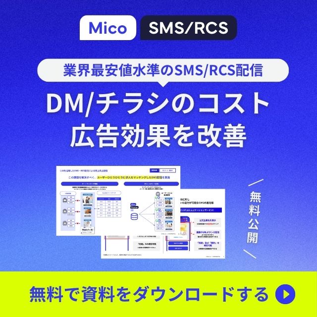 Mico SMS/RCSについてのサービス資料です。各チャネルの特徴やMico SMS/RCSで叶える業界別にご活用用途の事例を掲載しています。